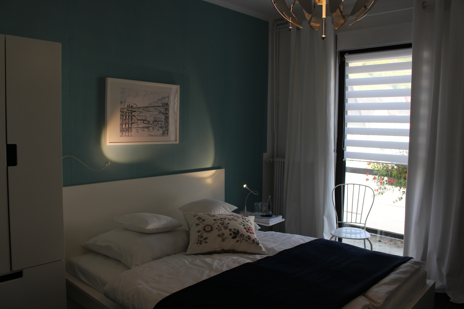 "sehr kleines" Standart-Doppelzimmer (Bett nur 160 cm breit - siehe Foto!) daher idealer zur Einzelzimmernutzung mit Balkon - Blick auf die Weinberge, kleines Bad (Dusche & WC), Waschbecken ist im Zimmer, Rolladen (Komplette Verdunklung möglich), "Morgensonne", kein Aufpreis wg. Einzelnutzung!, Haustier erlaubt