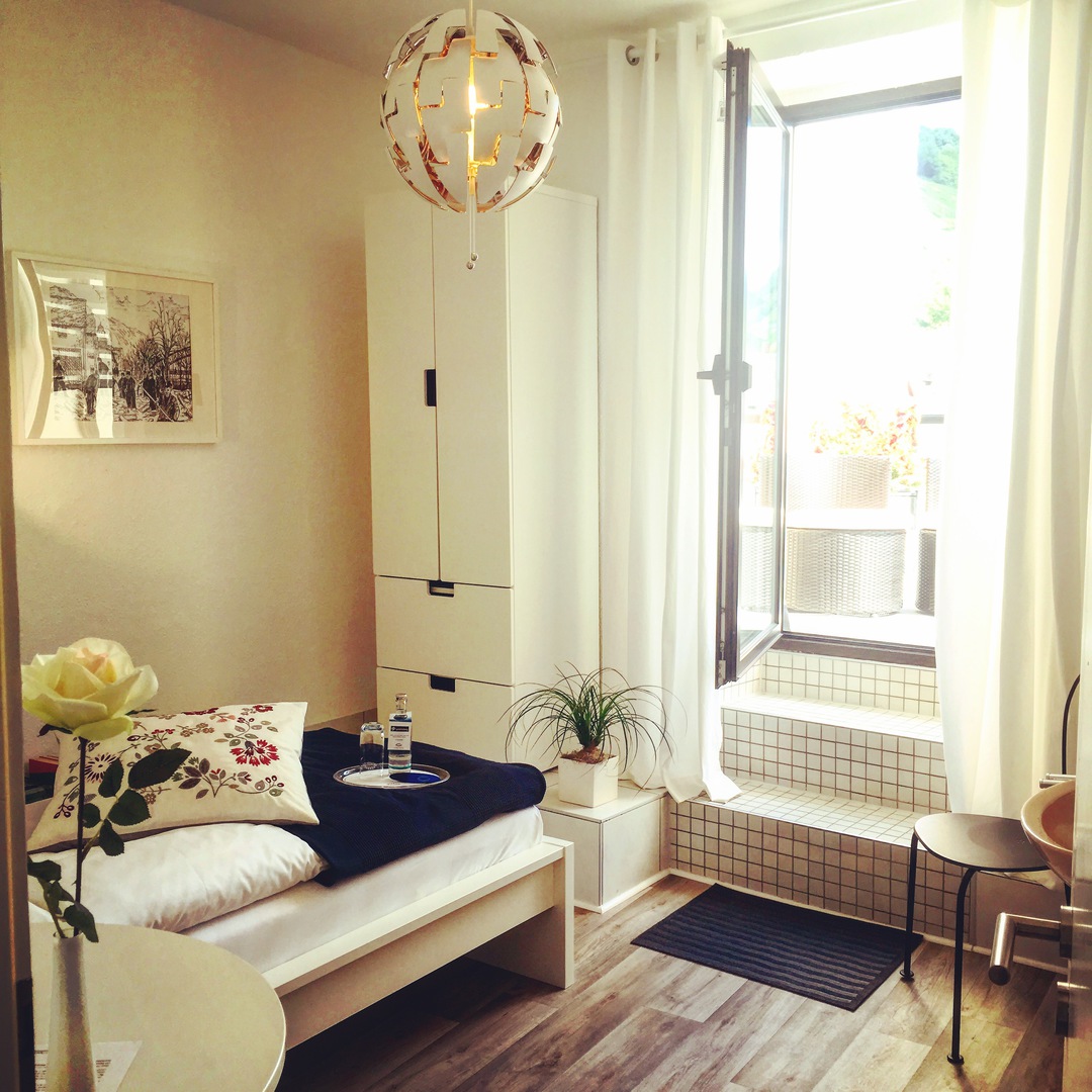 Einzelzimmer (Bett 95 cm breit - siehe Foto!) mit Zugang zur Sonnenterrasse mit wundervollem Blick auf die Lahn, sehr kleines Bad (Dusche, WC), Waschbecken befindet sich im Zimmer, "Morgensonne", KEINE Verdunklung möglich - nur Sichtschutz, Beletage, Haustier erlaubt