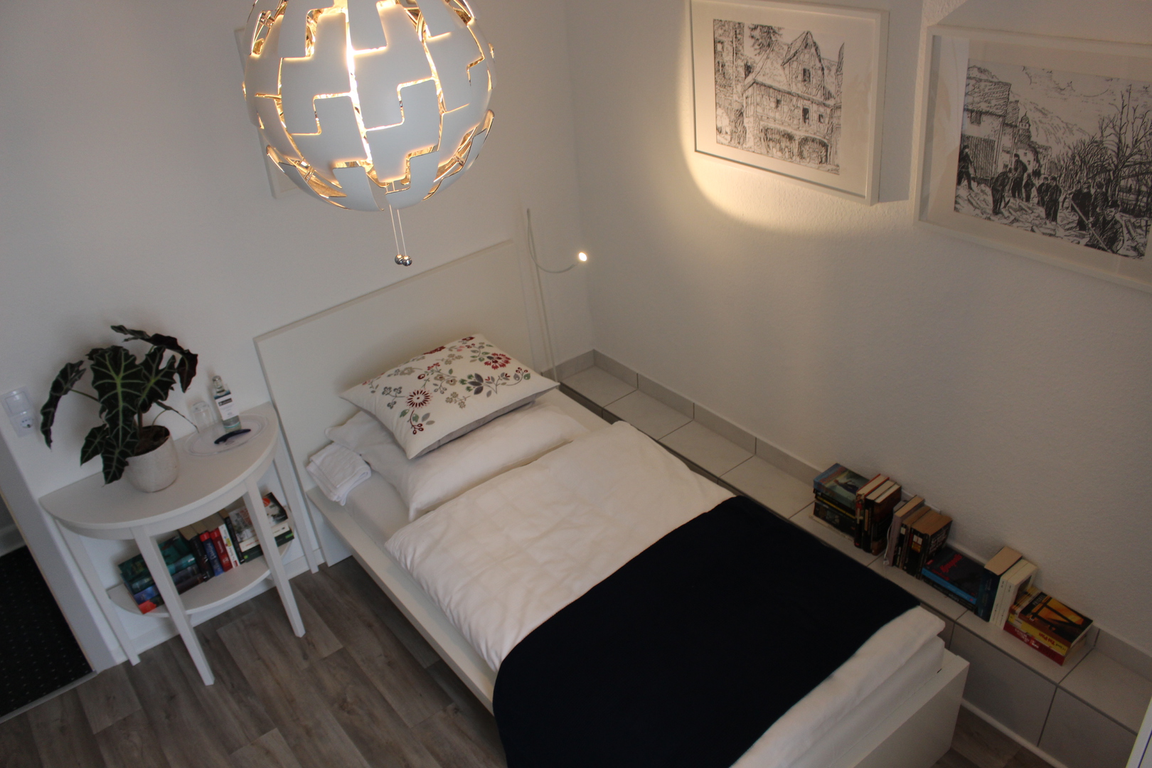 Einzelzimmer (Bett 80 cm breit - siehe Foto!) mit sonnigem Balkon und einzigartigem Blick auf die Lahn und das Kloster Arnstein, kleines Bad (Waschbecken & WC), eigene separate Dusche unmittelbar auf dem Flur gegenüber gelegen (Nutzung nur von # 5), TV/Fernseher, KEINE Verdunklung möglich - nur Sichtschutz, Beletage